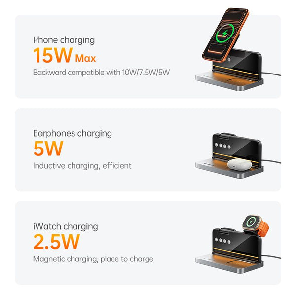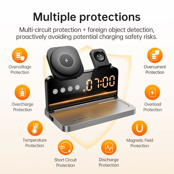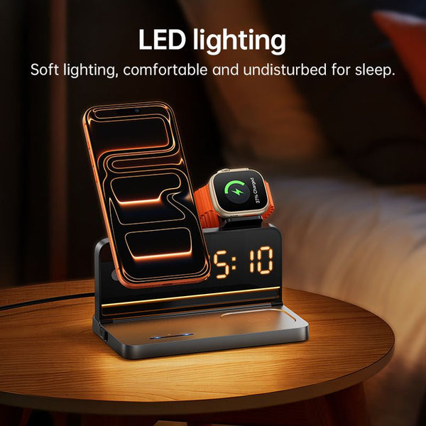 4-in-1 All-in-One Design – Wireless charging pad for your smartphone, dedicated spots for smartwatch and wireless earbuds, plus a built-in digital alarm clock function — all in a compact, sleek black housing.