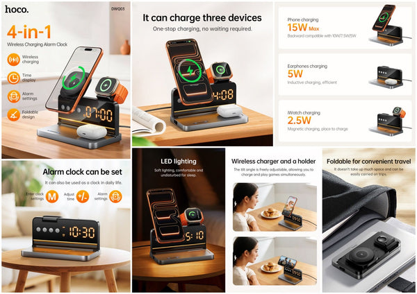Stay powered and on schedule with the HOCO DWQ03 4-in-1 Wireless Charging Station with Digital Alarm Clock — the all-in-one bedside or desk essential that simplifies your routine while keeping your devices charged and visible. Whether you’re waking up to an alarm or powering up your smartphone, smartwatch, and earbuds at once, this stylish black charger delivers convenience and speed.